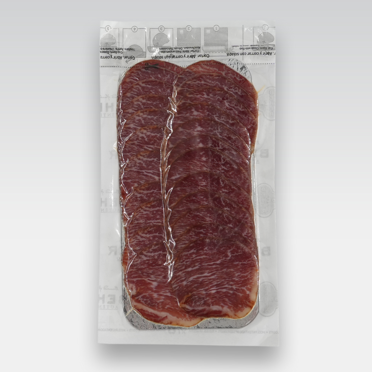 One of Spain’s most beloved charcuterie cuts, where the rich fat and tender meat of the 100% Ibérico breed are perfectly balanced with traditional seasonings. Paprika, garlic, and a touch of spice enhance—without overpowering—the unmistakable flavor of the 100% purebreed Ibérico pork, delivering a bold yet refined tasting experience.