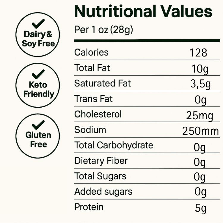 Our salchichón is made exclusively with 100% purebred Ibérico pork, raised free-range and naturally fed. We use no additives, preservatives, or added sugars. The flavor comes purely from the quality of the meat, natural spices, and a traditional curing process.
