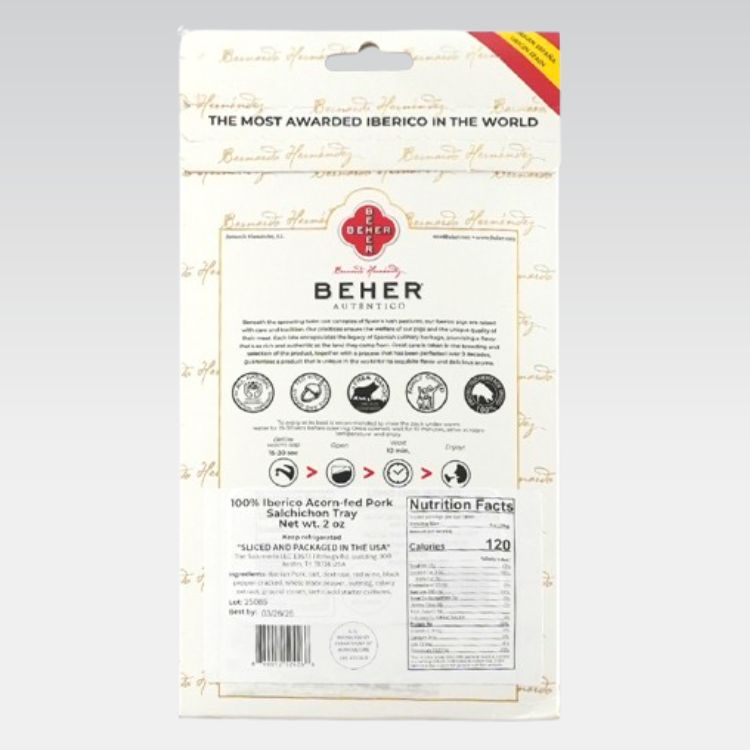 Made with 100% Ibérico pork and a clean list of real ingredients: sea salt, a splash of red wine, cracked black pepper, nutmeg, celery extract, and just a hint of clove. No artificial preservatives, no additives—just a blend of bold, natural flavors and starter cultures that support traditional dry-curing. The result? An authentic taste that’s rich, aromatic, and unmistakably Ibérico.